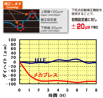 H1F-1通过闭合高度的自动补正功能(下死点自动补正功能),对于目标下死点位置,始终在±20μm以内进行补正。