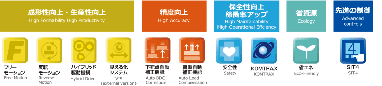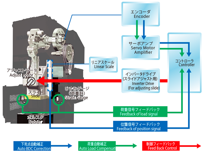 通过小松独创的反馈控制,高精度控制滑块位置。通过[下死点自动补正功能]和[载荷自动补正功能],测量下死点位置和载荷的变化,自动控制为一定的数值,实现了以前的机械压力机难以实现的高精度加工。