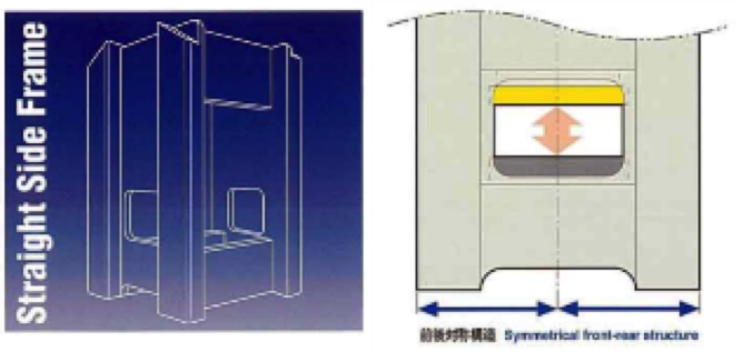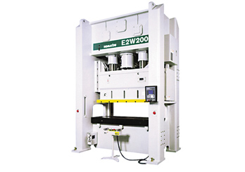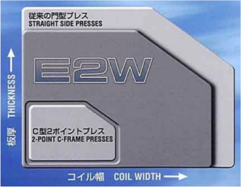 使用C型机架的顺送压力机进行2点冲压等作业时,无论如何都会产生开口的问题。顺送压力机还是没有开口的门型好。E2W,不但无需担心开口、管理和维护容易进行,是非常容易操作的压力机。