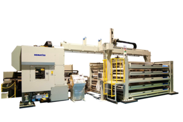 24小时无人运转概念的连发式冲压中心备有丰富的薄板供应和产品集成系统。从依样堆集薄板的标准系统到以产品总成为单位的分类系统,都有提供。